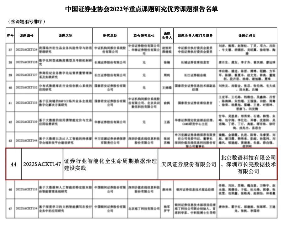 米兰体育与天风证券等公司联合报送的《证券行业智能化全生命周期数据治理建设实践课题研究》,成功入选中国证券业协会2022年重点课题研究优秀课题报告名单,也是数据治理领域唯一入选的课题。