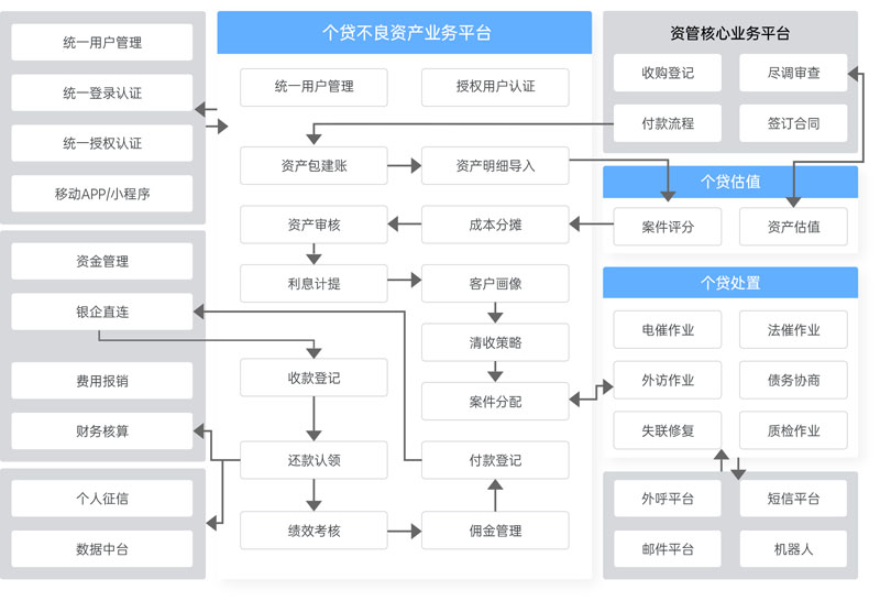 以客户需求为核心、以建设金融机构核心系统的思路构建AMC个人不良贷款业务系统,全面解决投前、投中及投后业财一体化问题,实现业务和管理的结构化、流程化、精细化、标准化、智能化,达到防范化解经营风险、规范业务操作、辅助管理决策、提高工作效率、促进业务发展、降低管理成本、提高资产管理效益的目的。
