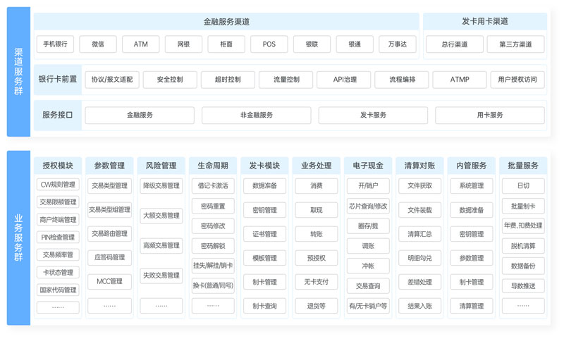 基于SunCard银行卡平台,广泛吸收已有客户的先进业务经验,学习已有客户的优质业务模型,以普惠客户为出发点,具备以客户为中心,以产品为业务框架,以卡体系为业务实体,以合约为业务纽带,以事件为业务驱动,辅以灵活多变的账户体系与计价体系的松耦合、高扩展、高效稳定的,完全自主知识产权的特点。系统包含卡管、密钥管理、数据准备、电子现金、制卡用卡五大微服务群,为银行提供借记卡全方位的业务处理支持。