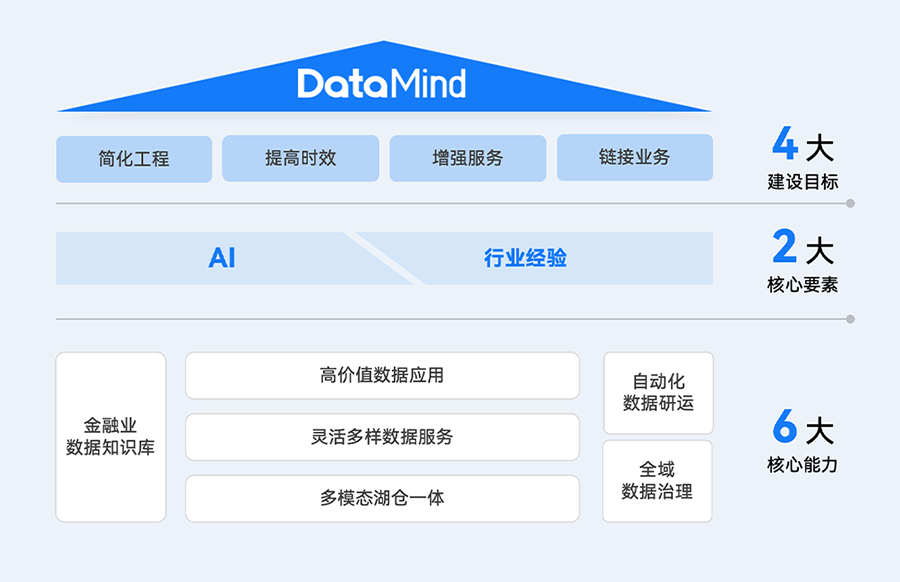 DataMind 定位于金融机构的"数据神经中枢",有机融合AI、BigData、Cloud、DataOps等前沿技术,提供覆盖多模态数据处理、实时数据湖仓构建、组件化数据服务、场景化数据应用的数智一体化产品。