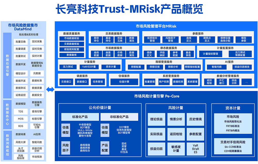方案以满足监管要求为基础,通过构建自主可控的市场风险管理系统,帮助银行提升市场风险业务管控能力、金融市场业务经营能力、金融工具公允价值估值能力,具体内容包括: