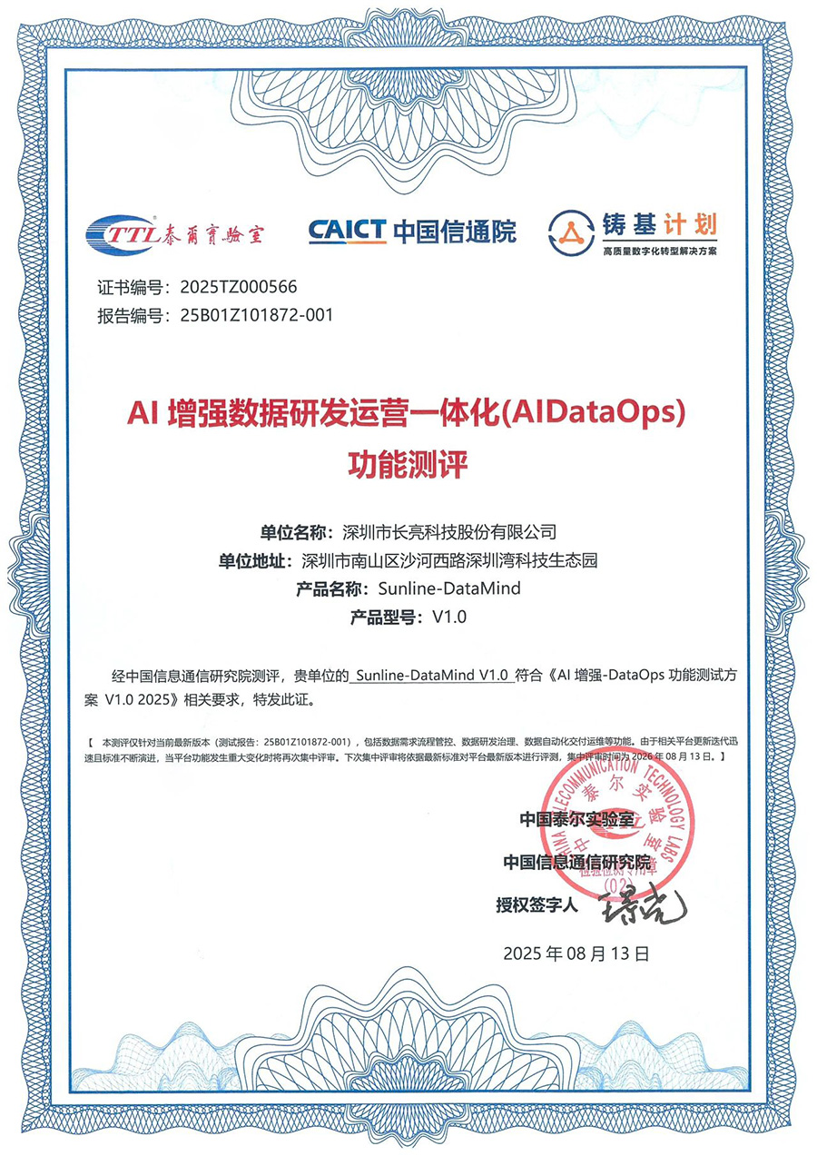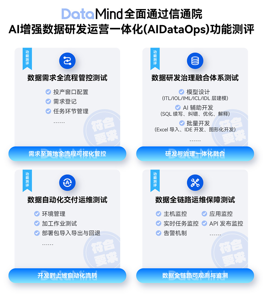 本次测评由信通院主导,依据《AI 增强 - DataOps 功能测试方案 V1.0 2025》标准,对DataMind的AI增强DataOps组件展开了全方位、深层次的功能验证。