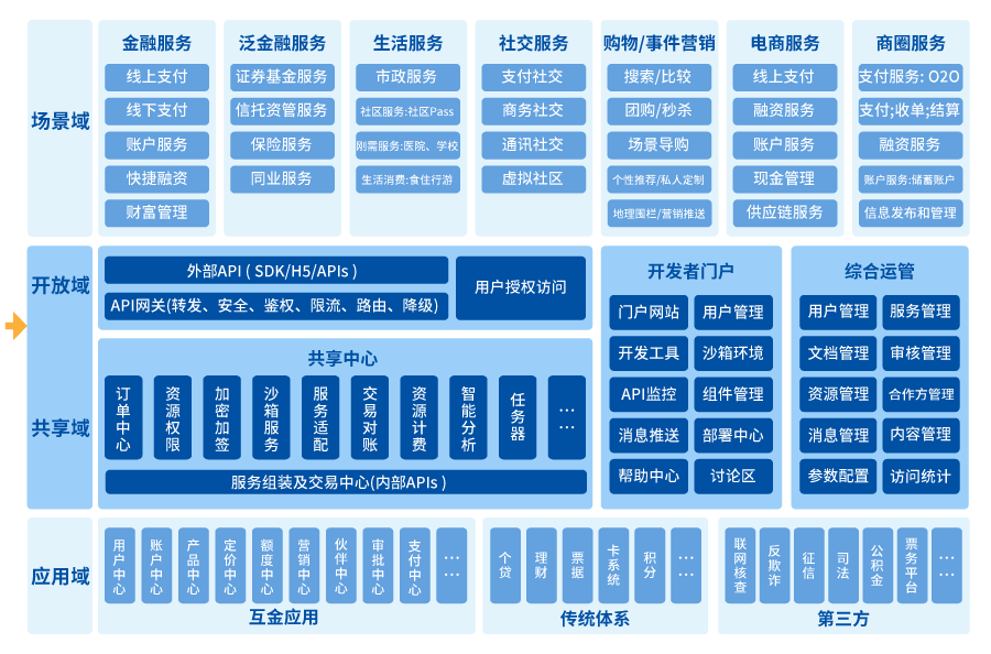 米兰体育开放平台通过共享域来整合应用的金融能力,通过开放域来将金融能力输出给场景方。