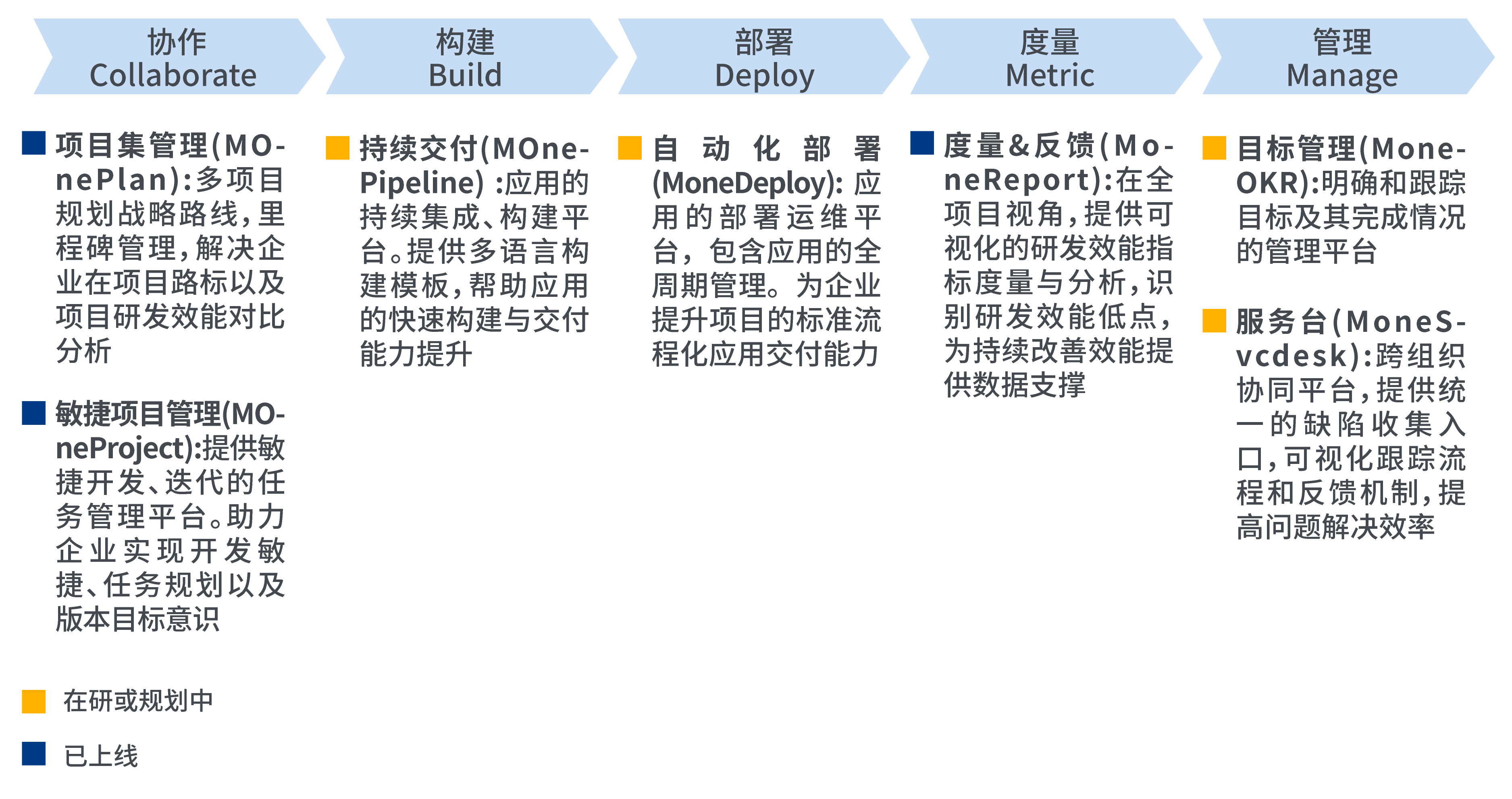◆ MOne覆盖产品研发全生命周期,从目标规划、需求管理、迭代跟踪、代码管理、构建管理、测试管理、部署发布全过程,实现研发管理一站式交付;
