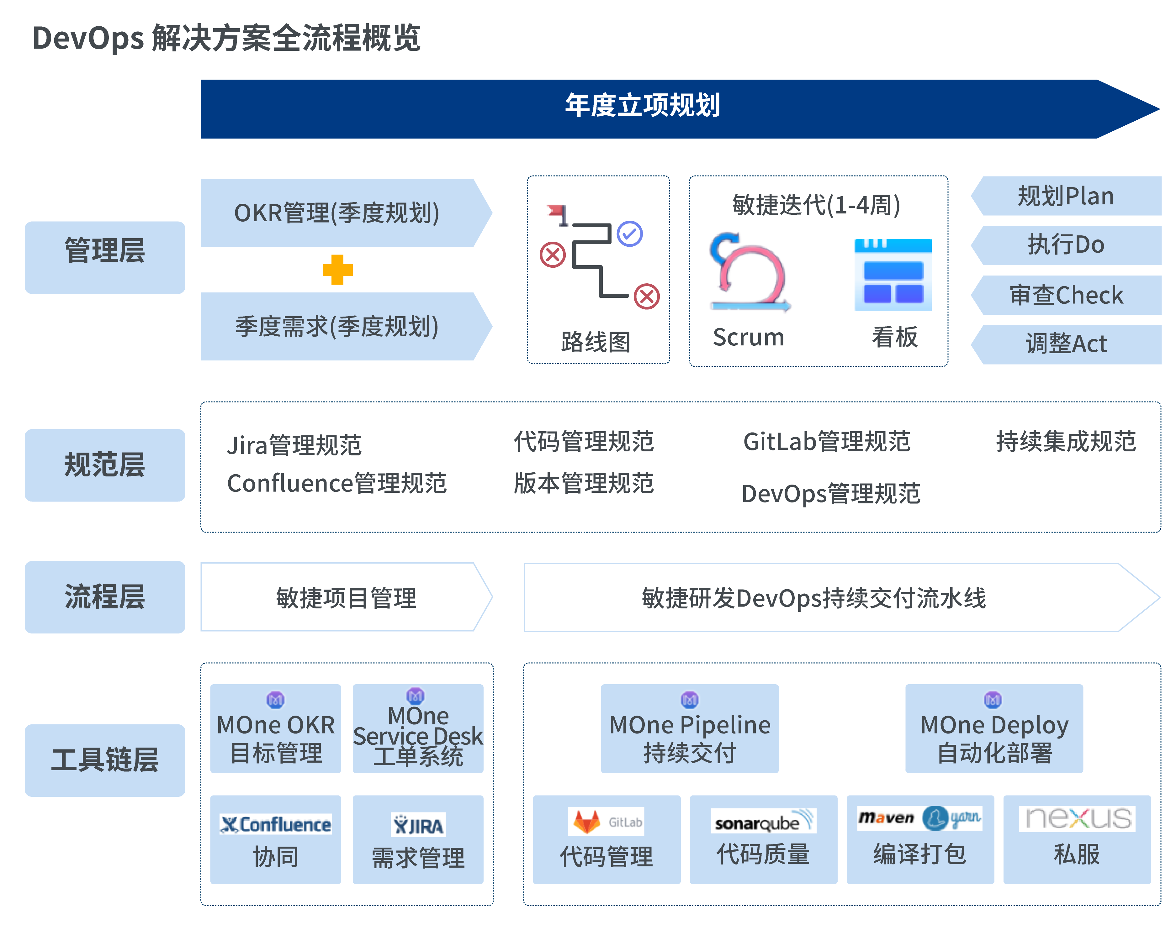 在实施 DevOps 过程中,基于 DevOps 理念,米兰体育通过自研的一站式研发协同管理平台(Manager One,以下简称MOne平台),实现了 DevOps 变革中工具的支撑,同时依托工具,制定了一套规范流程,将流程内建于工具之中,通过工具来指导实践。通过流程规范+工具机制,提炼了一套研发效能解决方案,即结合 MOne 平台与应用场景提供的敏捷项目管理、DevOps持续交付流水线及外部工单支持系列解决方案。