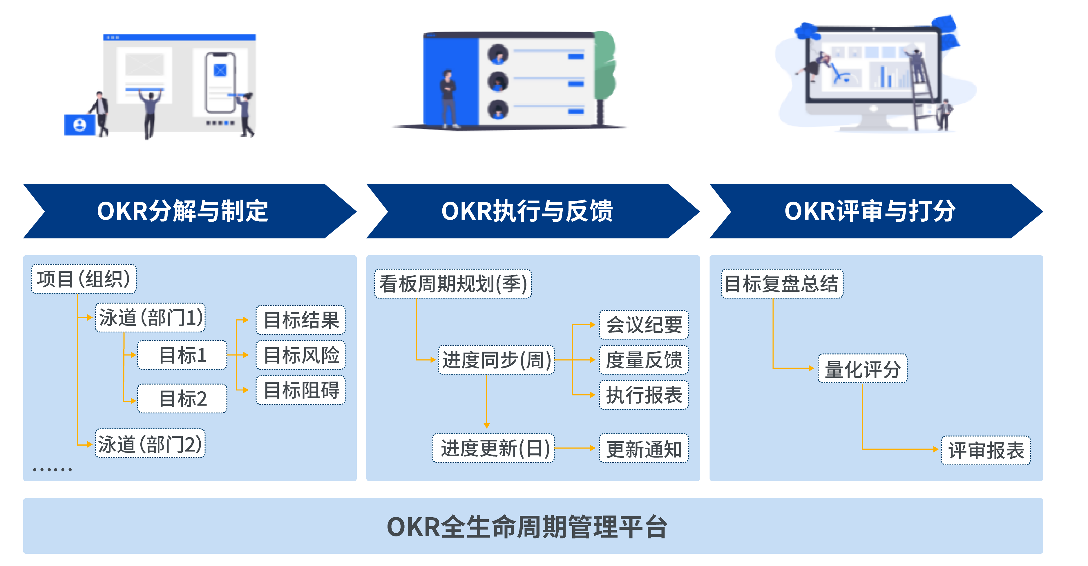 在功能方面,MOne OKR 规划季度(月度)短期目标,通过集成 Jira 实现自动跟踪和度量目标完成进度,结合 Scrum 敏捷开发方法,通过迭代冲刺的方式持续交付,从用户需求到需求实现一个个闭环的软件开发过程,实现季度规划、迭代实现,最终实现目标。