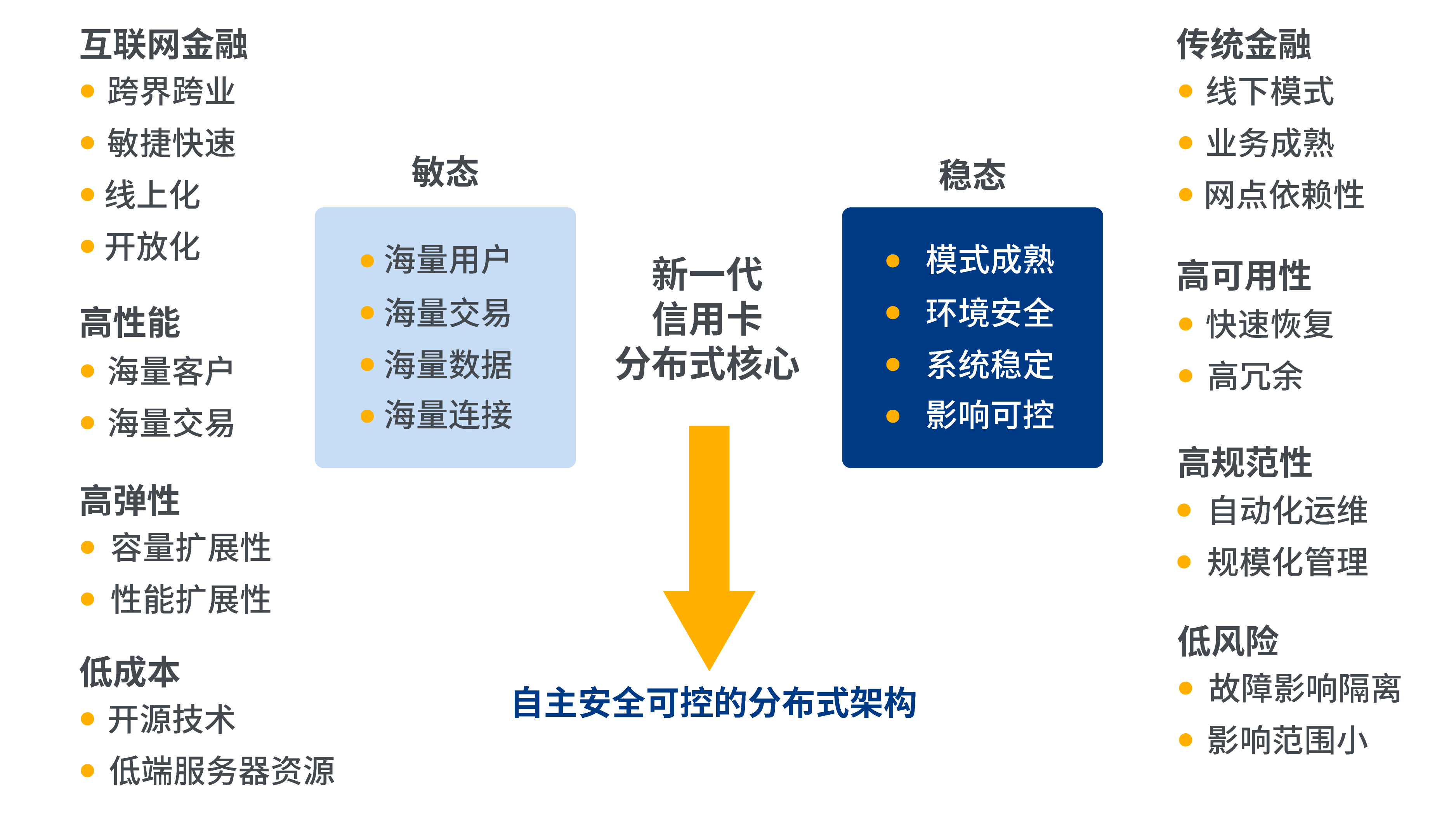 更重要的是,基于国内外大环境来看,银行作为国家经济命脉的支柱行业,其自主可控的基本定位已经上升到国家安全的战略高度。以安全保发展,以创新促发展,借助我国自主研发的软硬件技术,替代舶来的国外产品,打破潜在的战略安全隐患,是国家的必然选择、银行IT系统建设的必然趋势,也是信用卡核心系统发展的必由之路。