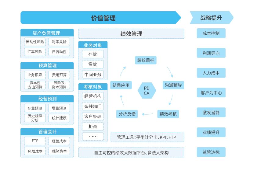 在业务架构上,绩效考核平台深度契合到银行整体经营与价值管理中,通过深入结合银行资产负债、预算等业务流程和管理需要,以绩效大数据平台为基础,经营业绩为重点,平衡计分卡、KPI等为工具,将银行的战略、资源、业务和行动有机地结合起来所构成的一个完整的管理体系,帮助银行实现对机构、部门、柜员以及客户经理等全员的精细化的绩效管理,实现全行的战略落地与绩效提升。