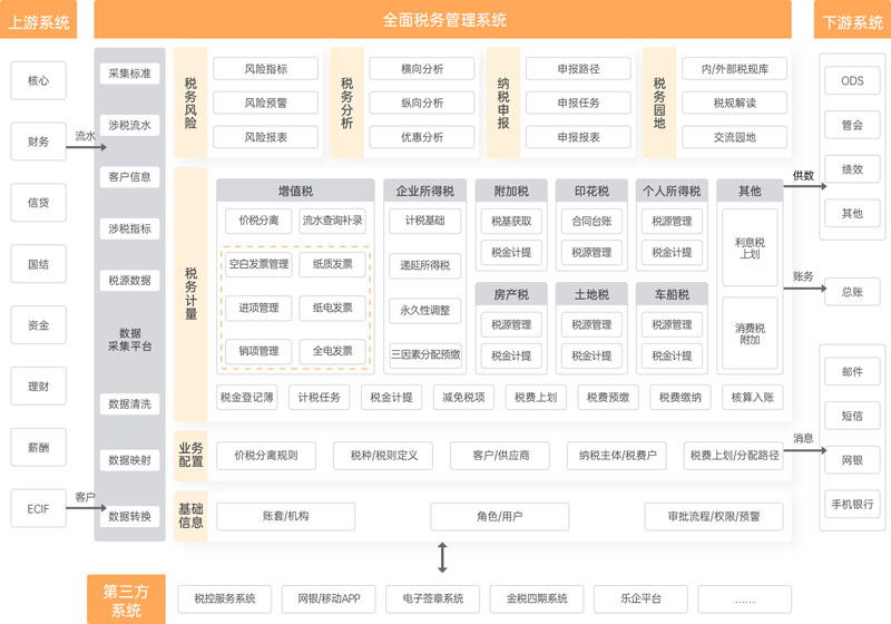 对金融机构的增值税及其附加税、印花税、房产税、土地使用税、车船税、个人所得税、企业所得税等全部税种进行涉税事务管理,采集各税种对应的业务数据形成涉税档案并计提相应税费,自动出具纳税申报报表;集中实现了增值税价税分离、销项管理、进项管理、发票开具、所得税汇算清缴等功能,帮助企业及时分析税负和筹划税务。