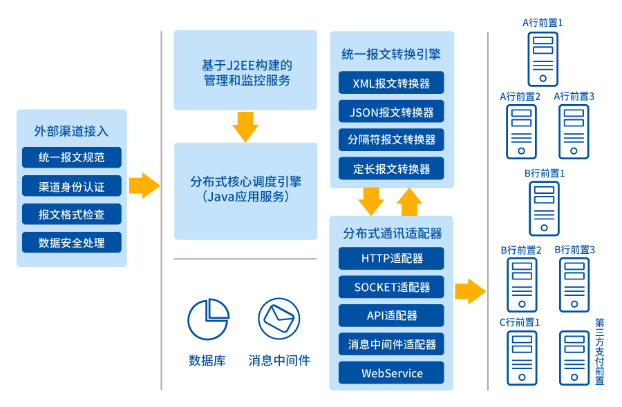 接口平台模块:为外部系统提供接入服务,包括指令接收、报文校验、安全检查、转发调度等功能,随着银行服务接口的不断扩充,接口平台也会跟着不断升级;