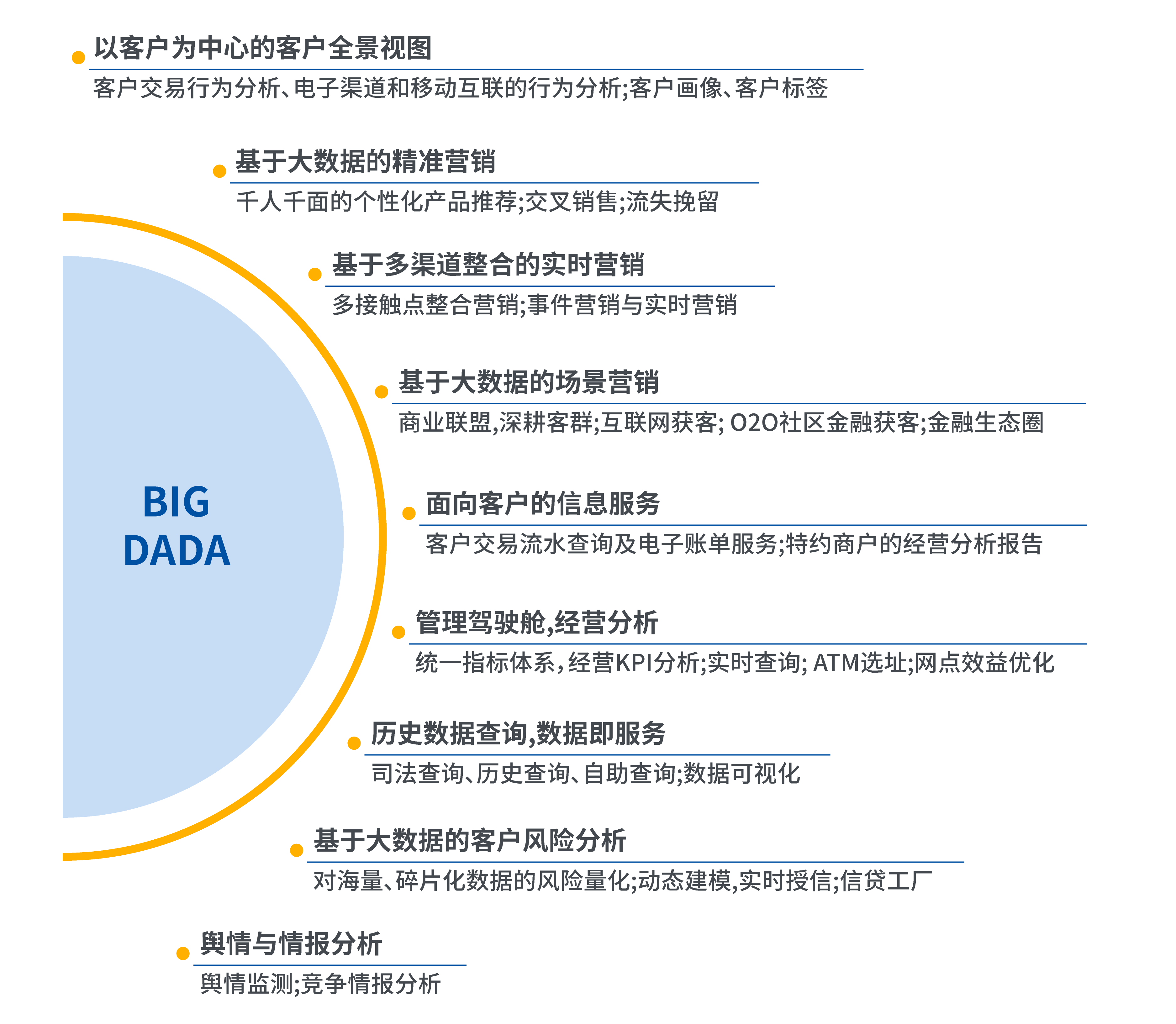 运营管理丨通过大数据分析平台,强化数据在业务协同中的价值,在市场营销、产品研发等环节真正实现以数据为驱动,加强总行统筹主导的集约化管理体系,全方面提升运营管理效率。还可以支持网点效益提升、ATM选址优化等。