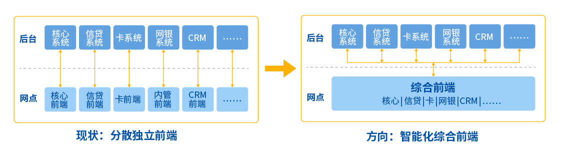 首先,要在横向上进行业务功能聚合,将原来分散在各个系统的前端功能统一整合到统一的前端平台中,并实现数据共享和统一高效的操作体验;在纵向上整合多系统、多设备作业流程,实现客户多渠道统一服务体验和网点产品协同营销。