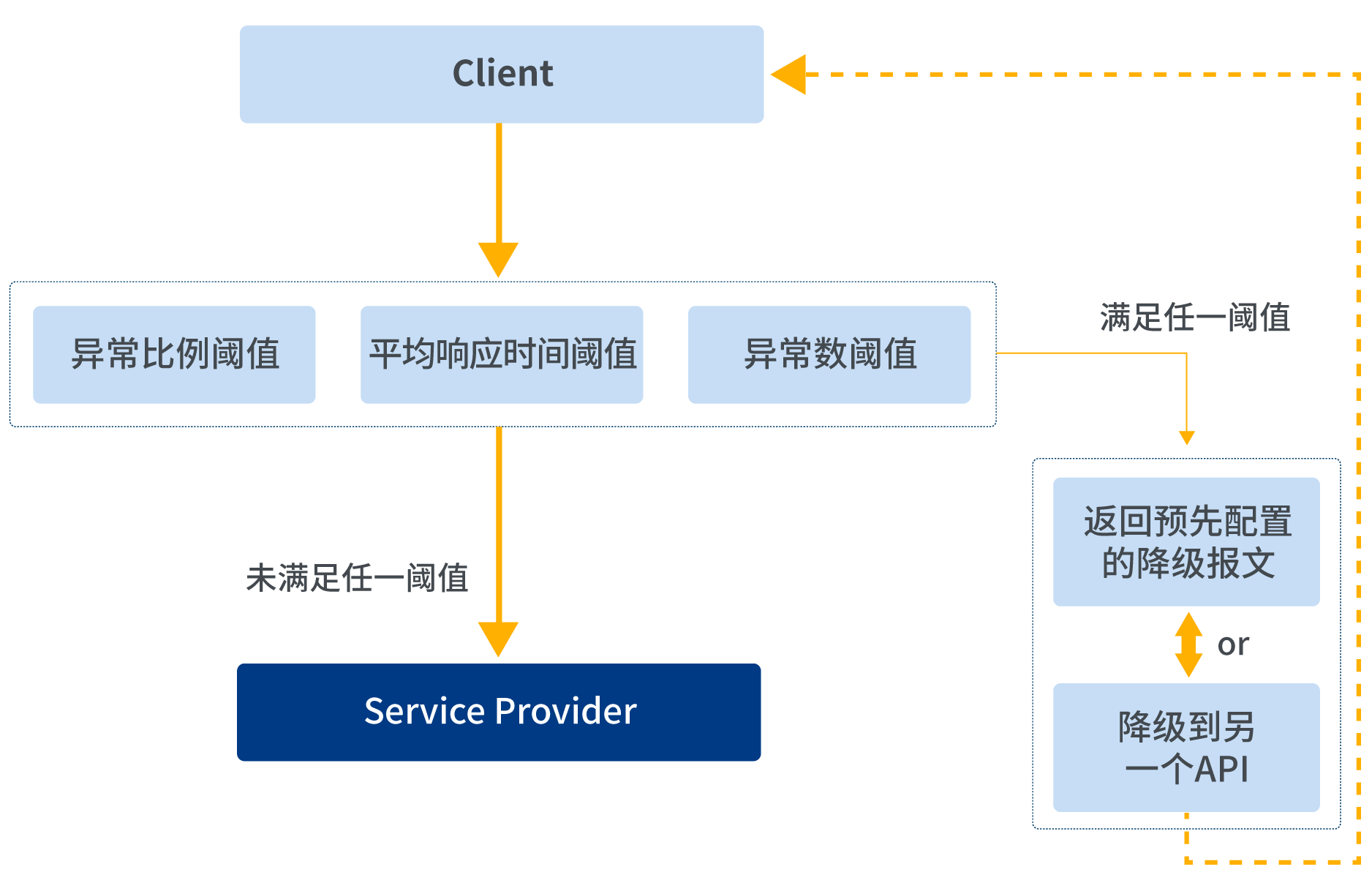 当服务故障时,为了防止整个系统的故障,对系统采取熔断降级策略。可根据平均响应时间、秒级异常比例、分钟级异常数等维度进行熔断降级处理。