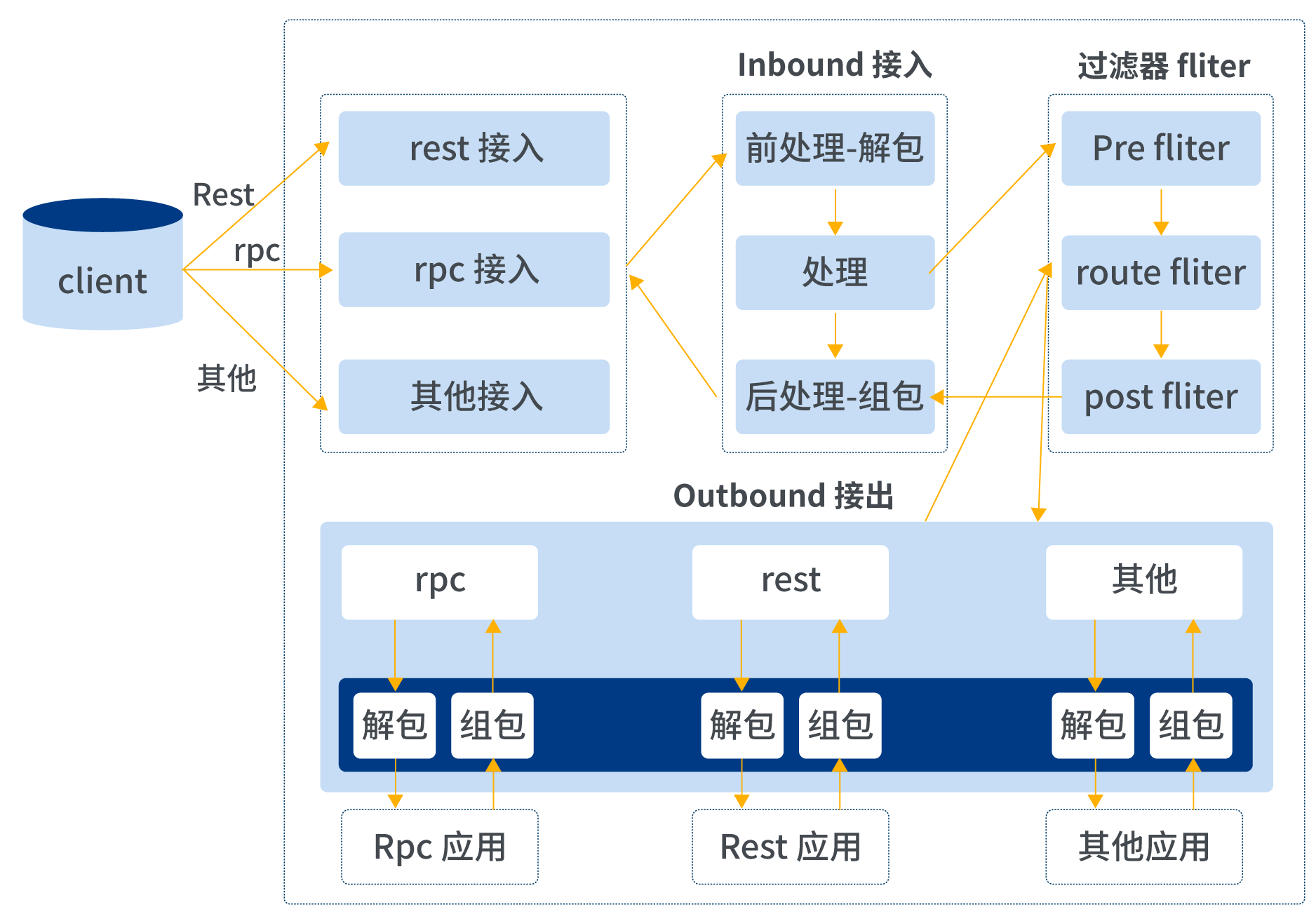 网关运行端采用了SPI机制,大大的增加了网关的扩展性,除市面上都支持的Fileter扩展、治理功能的扩展外,米兰体育还可提供接入接出(协议)的扩展,加解密方式、报文等多处位置的扩展,大大增加了网关的可扩展点: