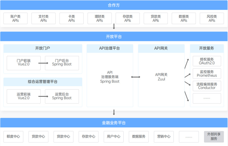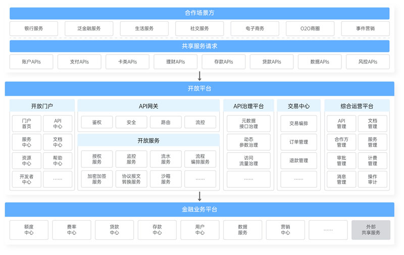 定位于基于微服务架构、采用服务可视化编排技术的开放服务平台,满足渠道与行内系统的通讯协议适配、报文适配、通讯安全、流量控制、交易路由、服务编排、渠道管理、接口管理等,以及整合行内金融能力包括但不限于账户、产品、支付等,连接外部合作方及行外系统,通过API、SDK、H5等开放模式快速对接不同行业生态场景,进而深入到多种业务场景,最终实现完整的银行金融服务与企业级运营能力的输出。