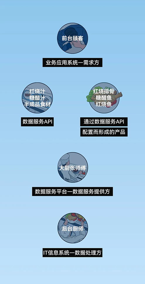 当餐厅前台和后厨低效的运转机制,对日常经营产生了负面影响,大厨张师傅的存在就显得尤为重要。而随着信息化程度越来越高,大多数金融机构面临着数据分散、数据利用率低等问题,经营效率难以有效提升。数据服务平台就如同“大厨张师傅”,能够将金融机构内部已梳理、沉淀的数据资产按需打造成API接口,并通过线上配置、服务编排等方式提供给业务方调用,快速形成数据服务能力,响应前端业务的快速变化。