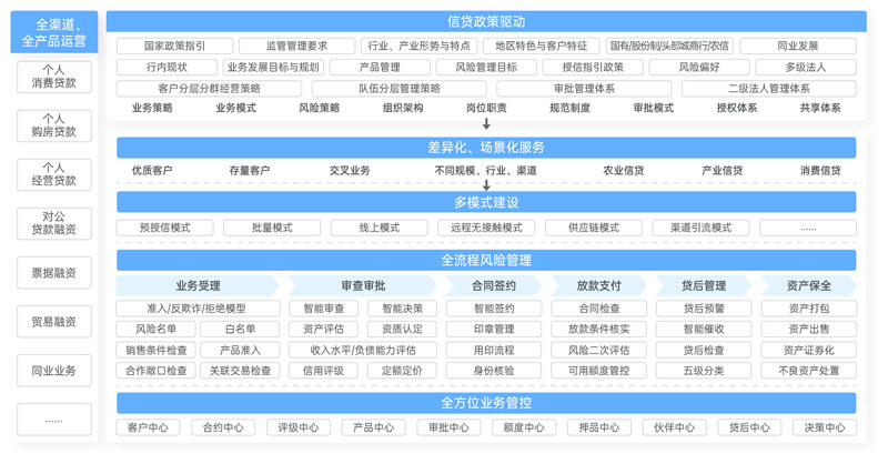 在业务应用层面,以“双客”(客户经理、客户)为中心、线下产品线上化、场景数字化,对不同行业、类别、风险等客户提供差异化服务,实现“千人千面”、“千人一面”,为客户提供量身定制的信贷产品,满足不同客户群体的需求;通过无纸化、业务移动化、流程可视化,优化信贷业务流程,简化办理流程,提升精细化管理水平;以业务逻辑划分各个独立又互相协作的能力中心,包括客户中心、产品中心、定价中心、额度中心、审批中心、评级中心、押品中心、贷后中心、核算中心等,支持金融机构以此为依托进行个人贷款、对公信贷、同业信贷、集团信贷、小微信贷、普惠业务、网贷业务(包括助贷、联合贷、信用付)等各类贷款业务的产品创新和运营创新。