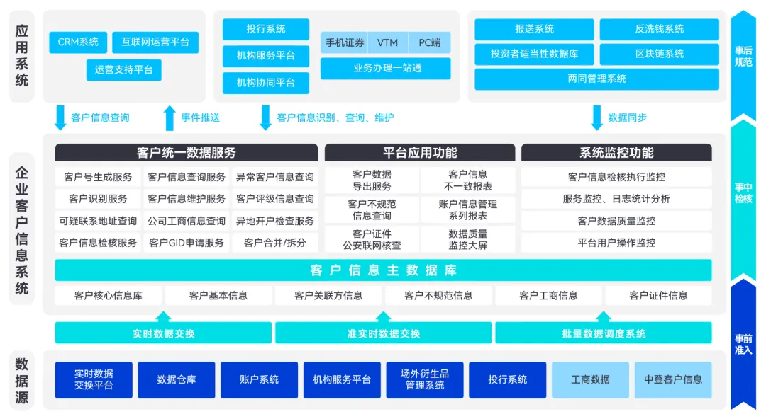 统一数据服务接口:为各业务系统提供实时的、完整的、共享的、准确的客户信息服务接口,包括客户新增、修改、删除、查询、检核、认证等服务;