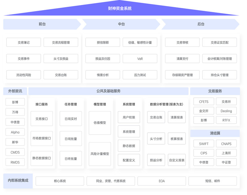 为金融机构资金业务条线打造专业的、最大化自主可控的资金前中后一体化资产信息系统,提供从前台交易,中台风险,到后台清算核算、报表统计等各项功能。