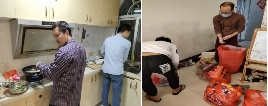 为减少疫情对项目进度的影响,华兴银行数据集市、华兴银行财务集市等项目组的成员早早回到了项目所在地自动隔离待命,确保复工后可以第一时间奔赴现场。由于疫情,大家没办法在外就餐,于是项目组成员就过成了一家人,一起在项目地打扫卫生、一起做饭,你洗碗来,我炒菜,欢乐一家亲。