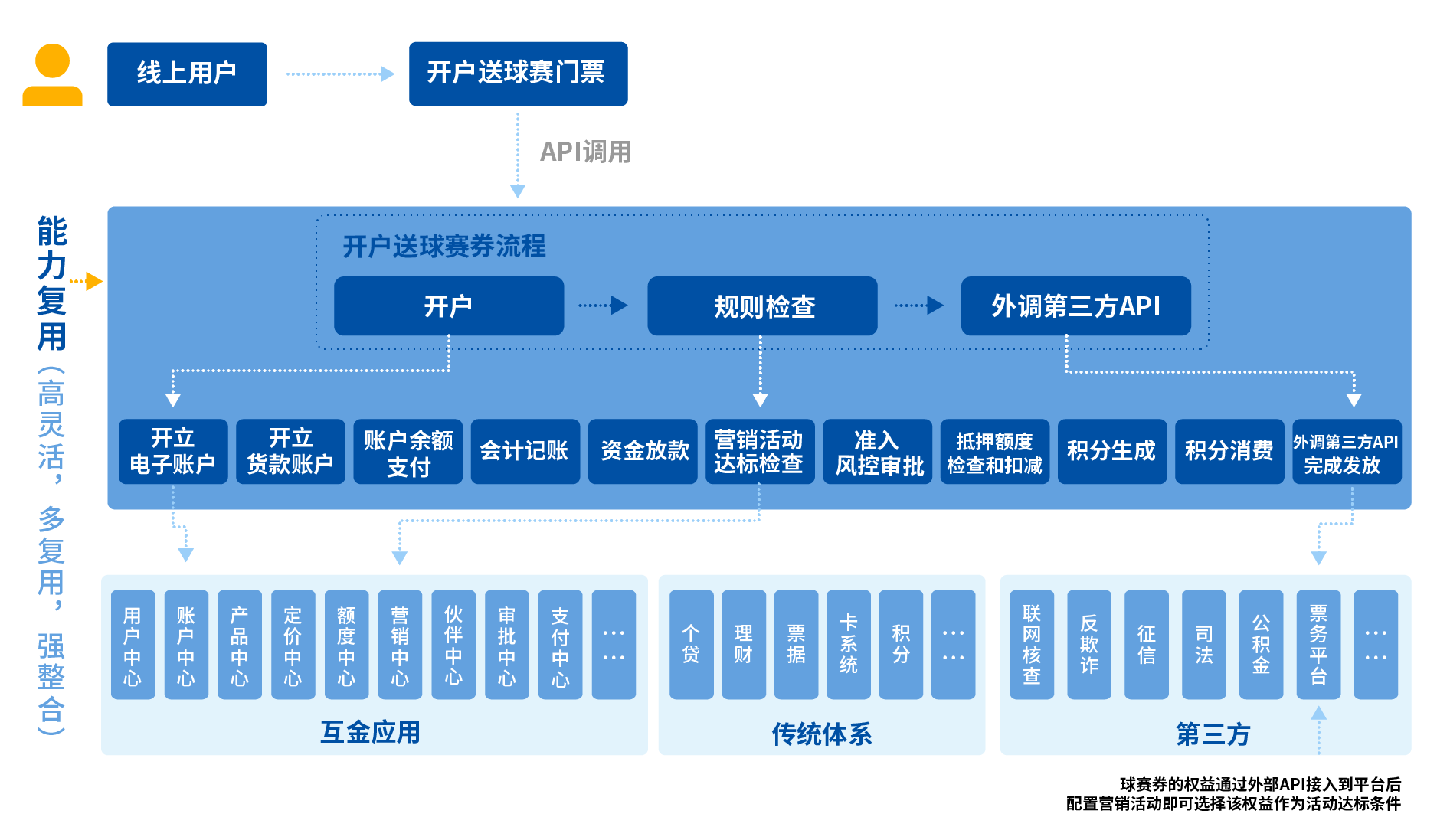 以开户送球赛门票为例:通过流程编排服务,组合账户中心的开立电子账号的API接口、营销中心的营销活动达标检查接口、票务平台的第三方API接口这三个服务,共同实现开户送球赛门票的场景。