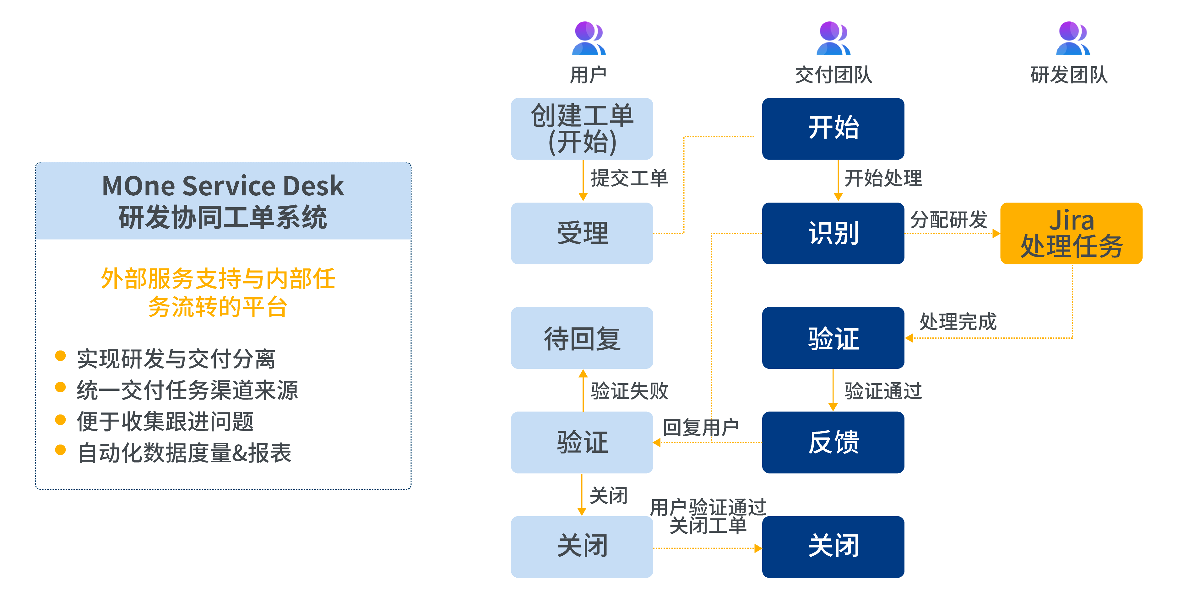 MOne Service Desk 研发协同工单系统为不同的使用者提供了对应的流程规范: