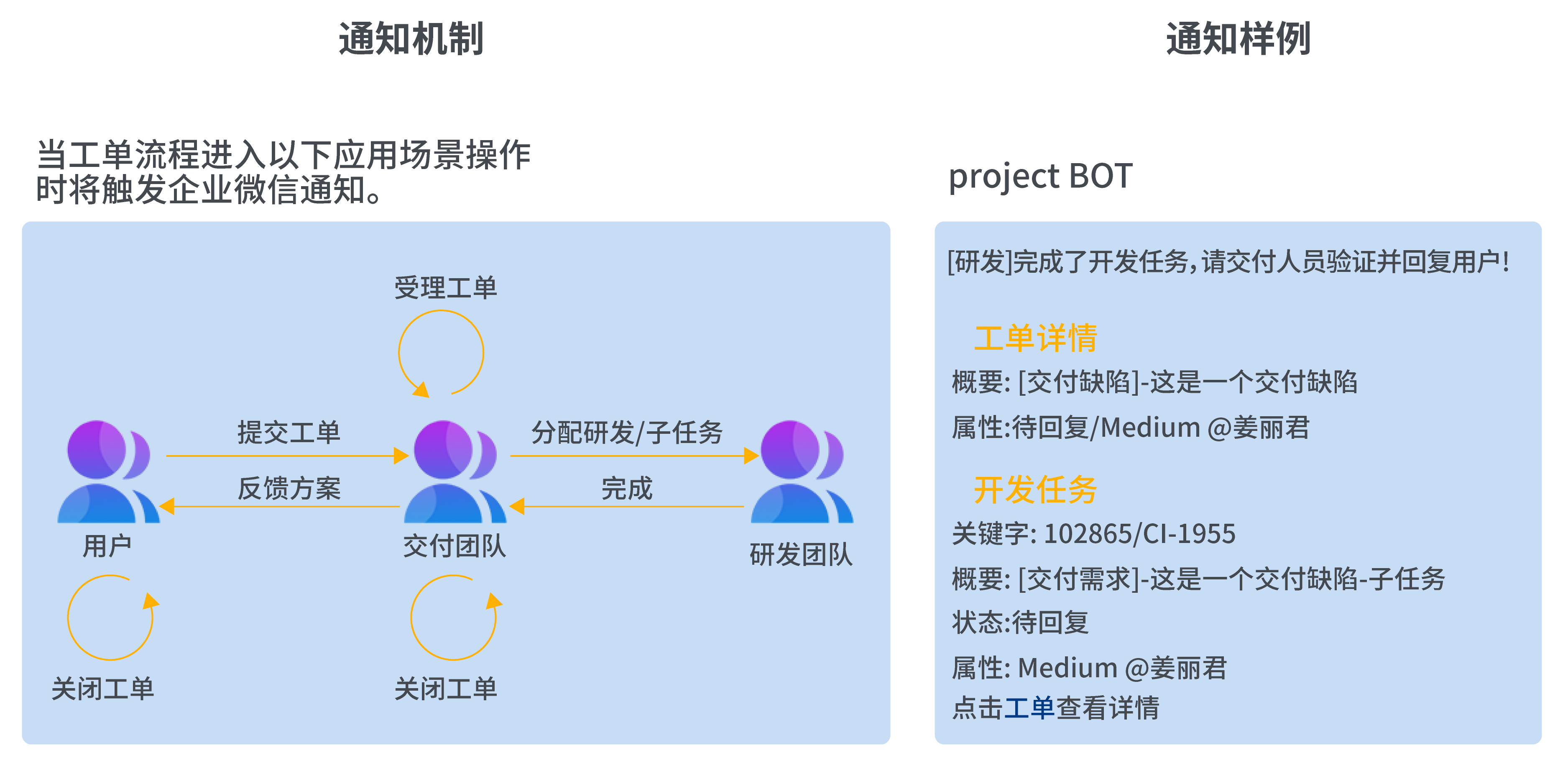 ◆企业微信通知机制:工单集成了企业微信机器人通知,当工单阶段流转时将触发企业微信通知。