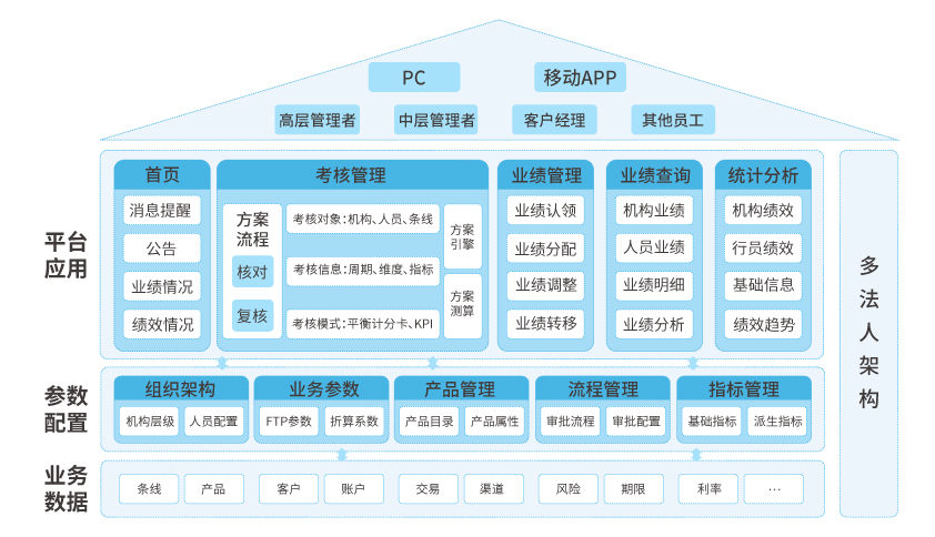 在产品架构上,帮助银行在全行统一考核体系框架下,实现各级法人、分支机构、营业网点和人员的差异化考核,各个层级可以灵活配置考核指标和考核方案,把绩效管理思路落地到信息化系统。