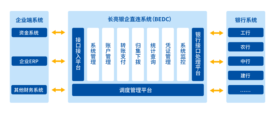 而我,其实就是链接银行系统(核心系统、现金管理系统等)和企业端的资金系统的中介,是这些银行接口的调度和管理者,我负责接收企业资金系统的指令转发给相应的银行,同时将银行的反馈信息即时返回给企业资金系统,那么企业资金系统就可以通过我接入,轻松连接所有合作的银行了。
