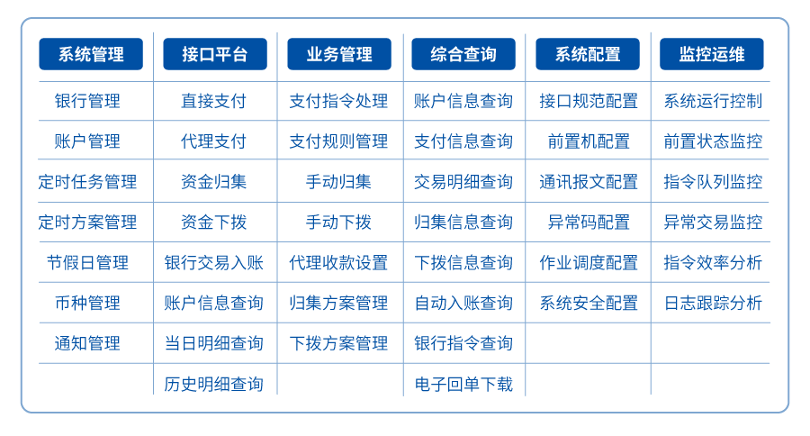 业务管理模块:对各业务模块发起的归集、支付重发、接口查询等操作进行处理;业务处理平台同时支持对资金归集、对外支付、入账管理等业务功能进行手工和定时操作;