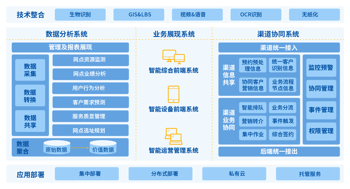 网点智能化服务流程离不开网点各系统的协同作业。而要实现多系统协同作业,网点首先需要对各渠道系统实现集中接入,完成对客户各个接触点的统一数据采集、监测及分析;并在此基础上,实现网点的协同精准营销和协同客户服务体验。
