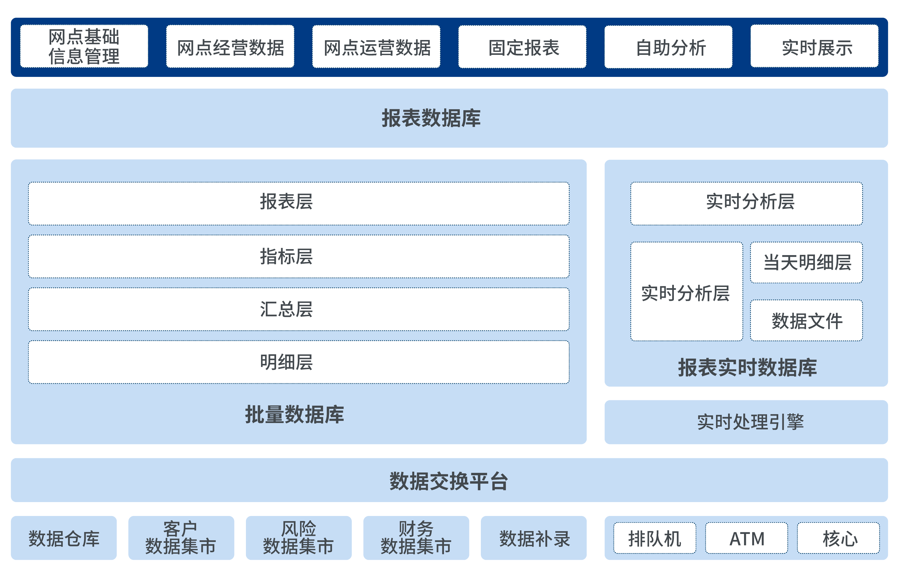 该方案在批量数据层面,全面整合业务系统客户、财务、风险等业务领域数据,实现对网点经营绩效的全面分析;在实时数据层面,对接柜面、ATM、自助查询机、VTS、排队机等渠道系统,支持对网点运营效率的实时监控管理。基于后端的数据支持,通过丰富的展示方式向管理人员提供宏观和微观业务运营状况,为网点管理人员提高网点服务水平、网点的效益、工作效率做服务支撑。