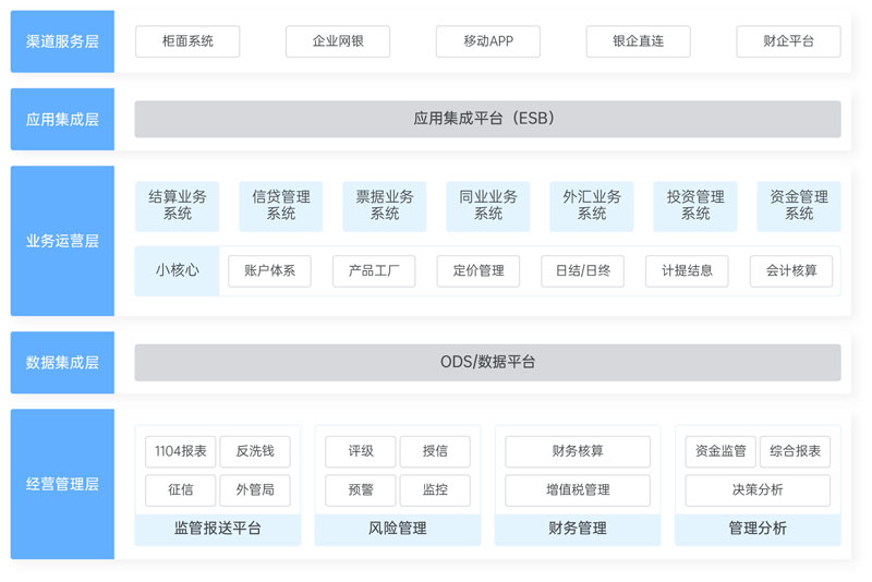 基于商业银行核心架构体系,采用模型化、组件化、参数化设计思想,通过微服务、分布式、云计算等新技术平台,提供“以客户为中心,以产品为驱动,集全面业务管理、网上金融服务、监督决策于一体”的一站式金融解决方案,为财务公司搭建一体化的金融服务平台,并支撑全流程的业务管理体系。