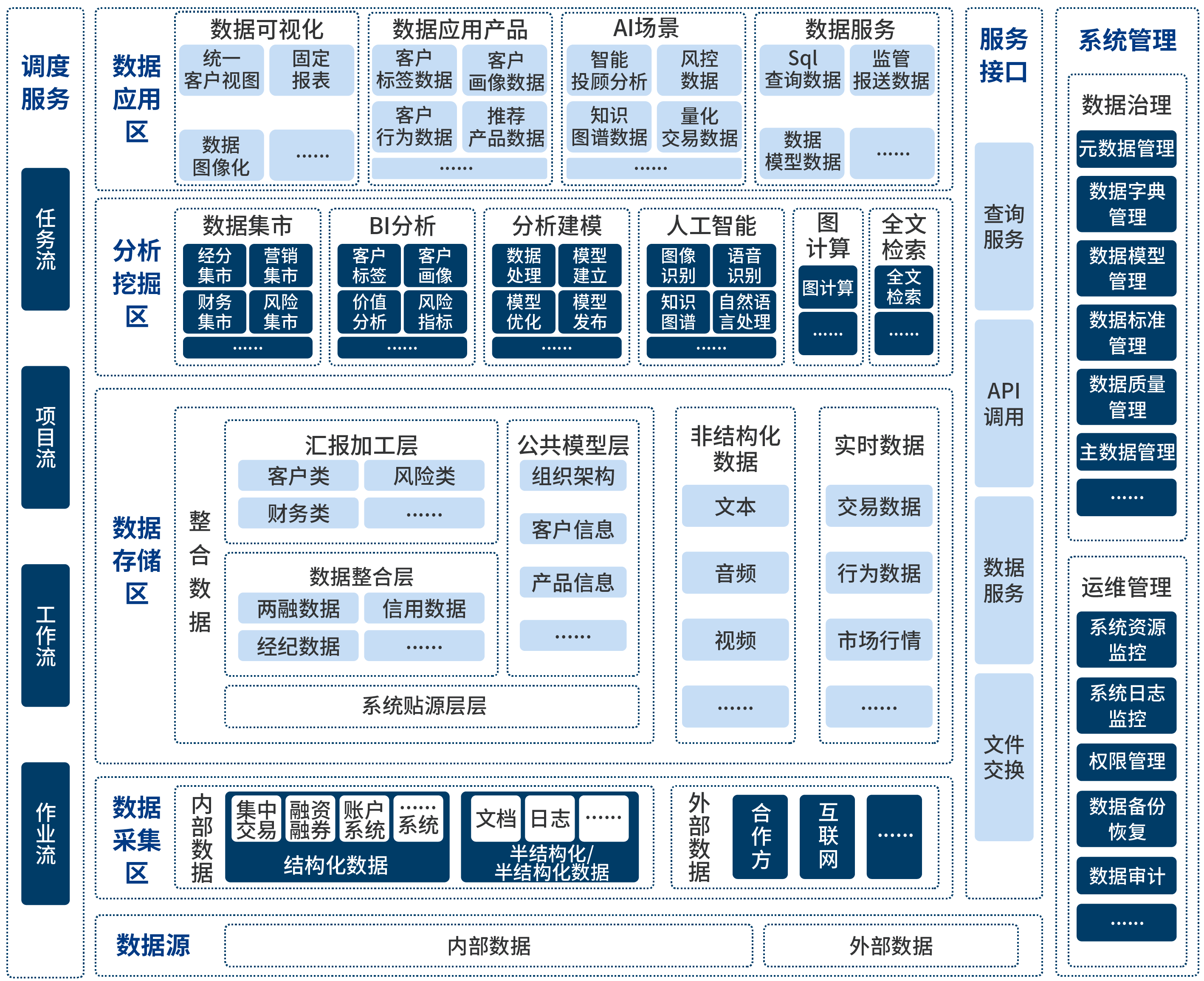 随着证券行业大环境的变化,证券公司为实现业务战略转型、业务变革与创新发展,对数据的分析、应用提出了更高的要求。基于大数据平台,可有效整合企业内外部数据信息,构建金融科技基础能力,为证券公司业务拓展提供数据应用、数据分析、数据洞察决策等敏捷支撑。