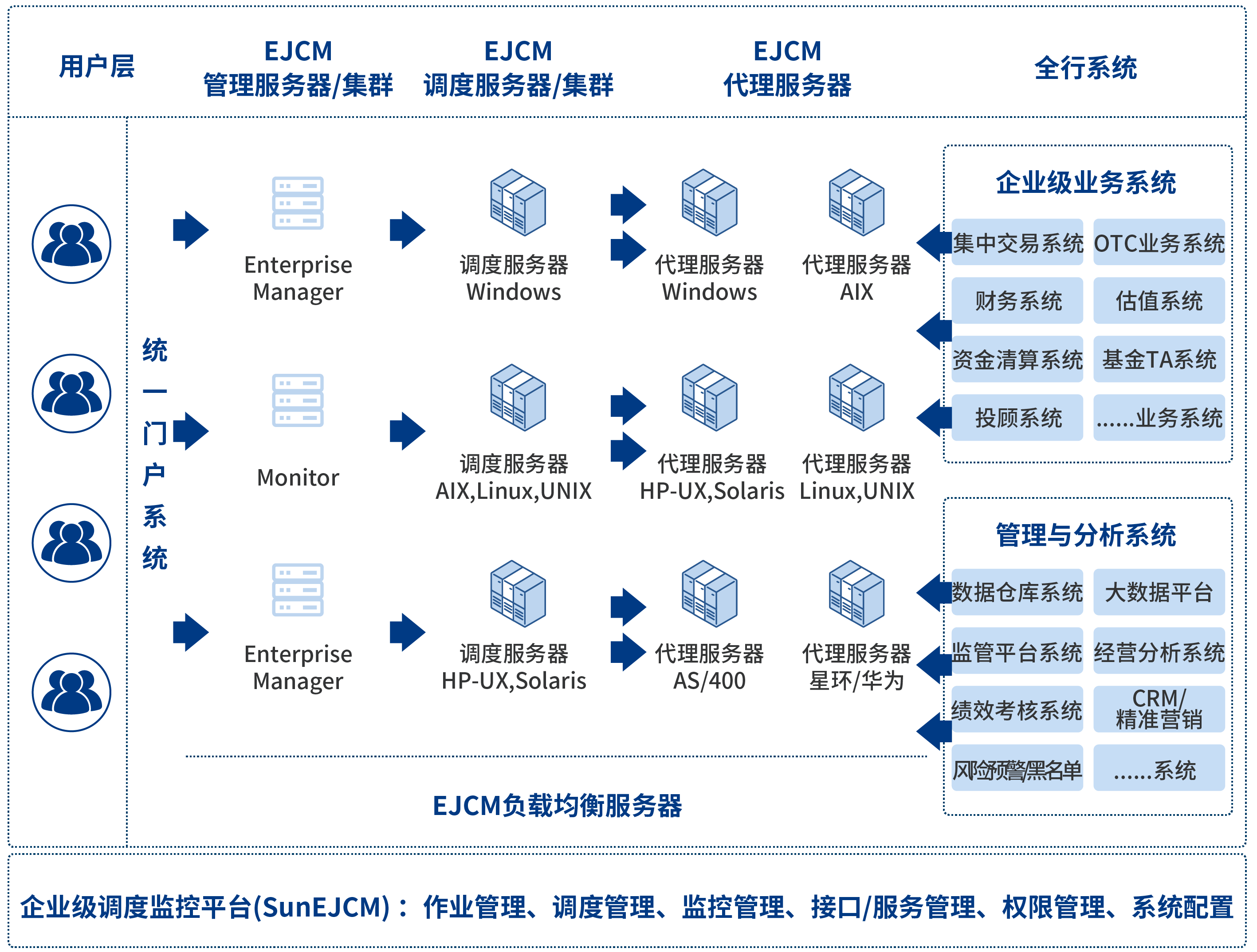 定位于证券公司内应用系统批量任务的总体调度与实时监控,支持多平台跨应用,贯穿企业的批量任务线,将业务系统、渠道系统、管理系统、大数据系统的所有批量任务进行统一集中管理,通过任务间的依赖关系融为一体,具备跑批任务触发、跑批任务状态监控、跑批任务日志展示、运行性能监控、故障报警等功能。