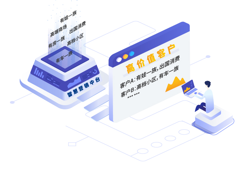 某银行缺少标签系统,c端客户大额资金动账类信息无法及时传递到前台,银行客户经理很难掌握关键营销机会,导致该行资金流失严重,80% c端零售客户最终成为低价值客户。而通过新一代智慧营销中台建立“有房一族”“有车一族”“有娃一族”“出国消费”“高档小区”“高端商场”等标签,构建360用户画像,可快速发掘和识别出高价值潜力c端客户。