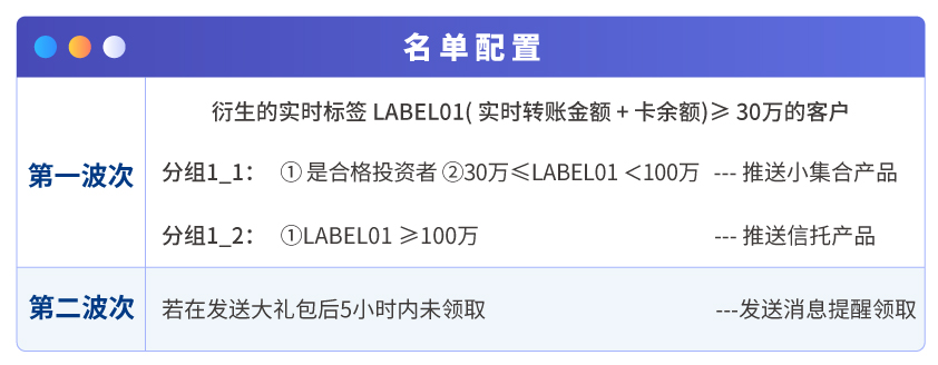 新一代智慧营销中台可根据银行营销活动具体业务需求,对活动对象最多10次的多波次多分组设计,通过客户标签筛选受众,实现目标人群的精细划分,提升关键指标和运营效率。