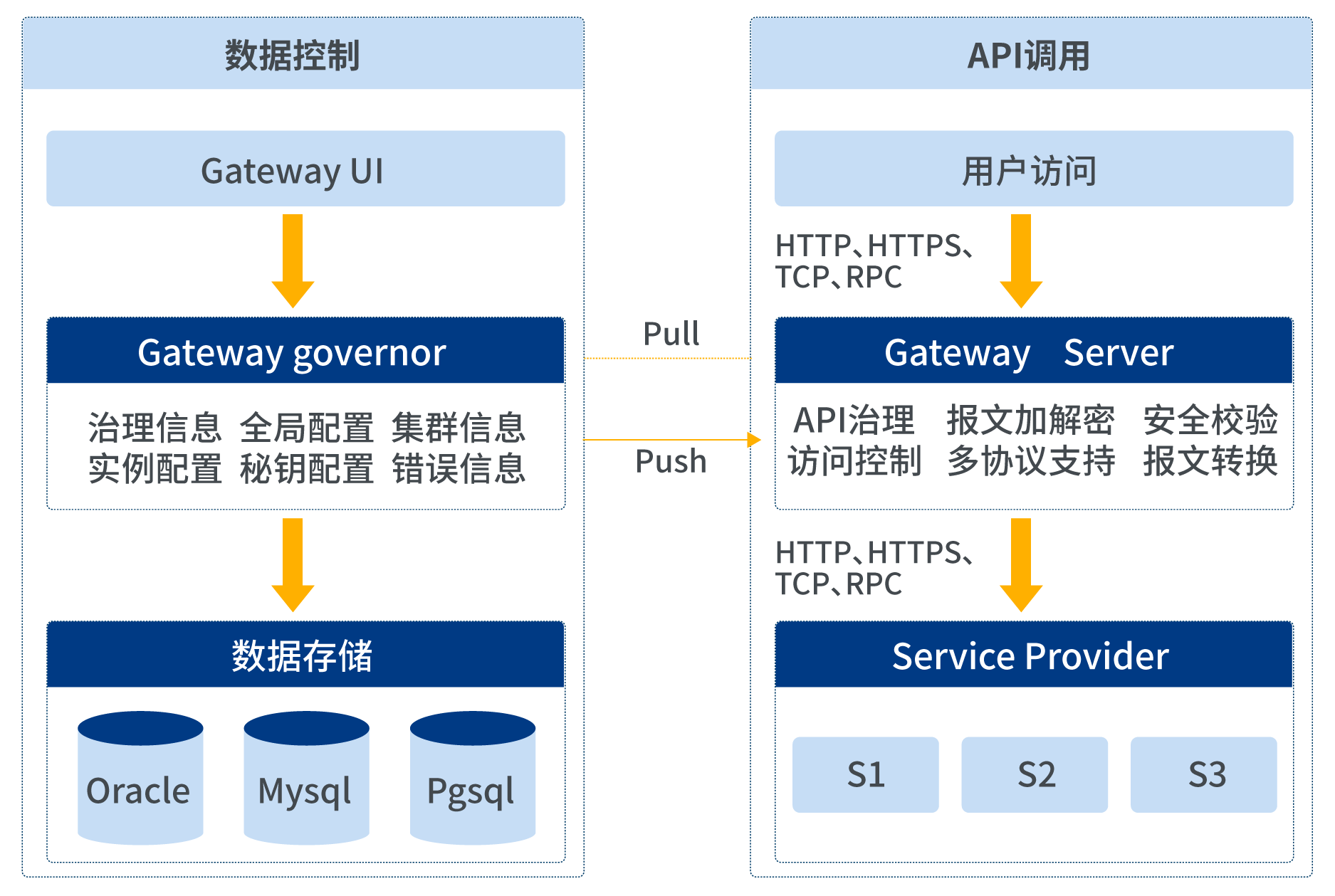 • 管控端主要作用为管理网关配置、UI交互、推送数据到网关运行端等,管控端和服务端分工明确,让真正负责处理请求的网关运行端,争取资源最大化。